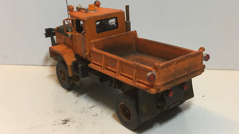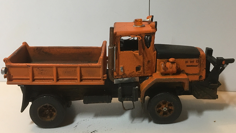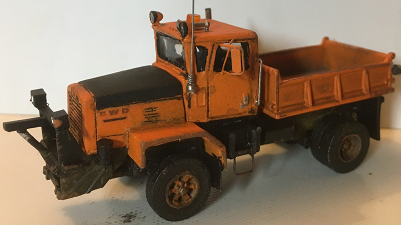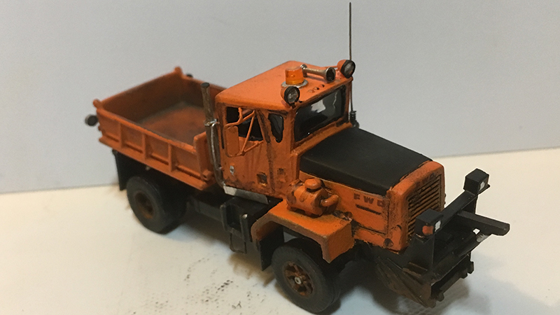Here’s an FWD Tractioneer Brian Donato built using an eBay resin cab and hood/fenders casting. The decals were from the kit as well. The wheels are cast metal from Sheepscot and the chassis is from Boley. The dump bed is from Life-Like with Ralph Ratcliffe Models square stepped fuel tanks, and a scratchbuilt plow frame from styrene.
