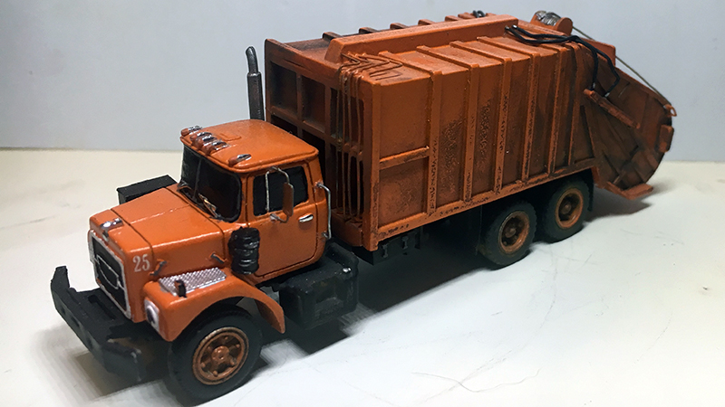 This Brockway 758 garbage truck from Brian Donato was built using a Ralph Ratcliffe Models resin cab and a Ralph Ratcliffe Models Leach 2RII garbage compactor body kit, and a Ratcliffe front bumper. The chassis is from Herpa with wheels and tires from Boley. The fuel tanks are from Athearn, exhaust stack is from Magnuson, hydraulic lines are a combination of bead wire for hard lines and insulated electrical wire for flex hoses, the winch cable and hand rails are also bead wire, and mirrors are from A-Line.