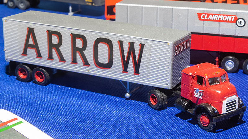 Bob Sundstrom, publisher of Model Freightways, had a large fleet of "typical" LTL fleet tractor-trailers on display at the 2018 East Coast Meet in W. Springfield, Massachusetts. Here is his Arrow Carrier Corporation GMC Cannonball truck tractor built using a Sylvan Scale Models resin kit and 35' trailer.