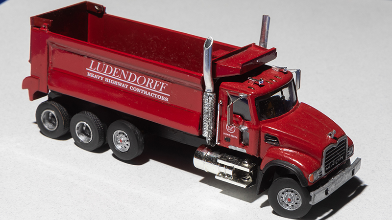 Jason Zerrenner had a large fleet of road and highway maintenance vehicles on display at the 2018 East Coast Meet in W. Springfield, Massachusetts. Shown here is Mack Granite dump truck. Jason used a Masterbilt Models out of production Granite resin cab and hood mounted on a Promotex chassis with Dennis Aust wheels. The dump body is scratchbuilt.