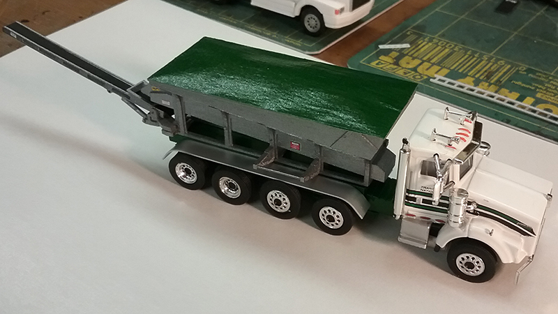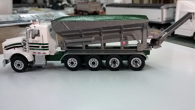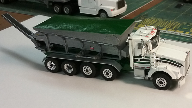 Brad Hassler built this Stone Slinger aggregate conveyor truck using a Shapeways 3D printed body, adding full fenders, tarp, etc. and mounting on a Promotex chassis with Trucks N' Stuff Kenworth T800W cab.