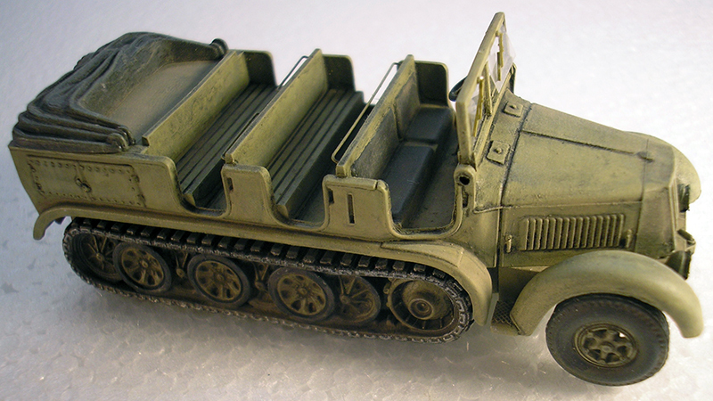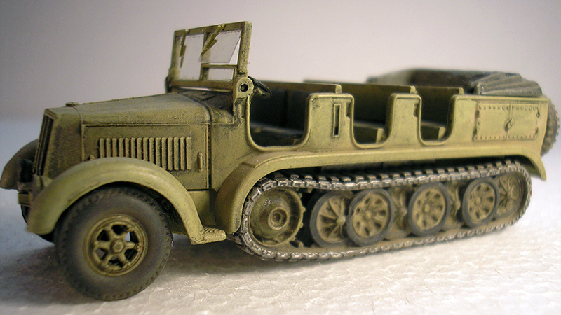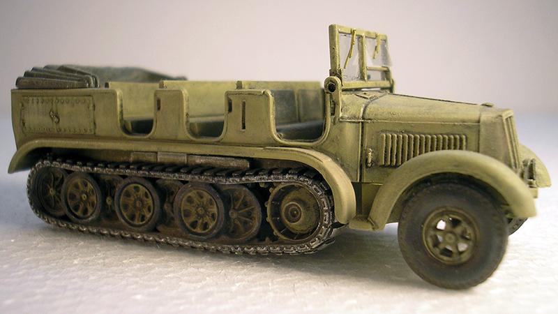 The Roco version of the World War II German SdKfz 7 medium towing tractor is, according to Rick Hoskinson, a good representation of this vehicle and only a few add on details were required to give it a more realistic appearance. The track surfaces were enhanced by adding strip styrene, the solid front wheels were replaced with a spoke type from the Roco Henschel cargo truck, and front tires and windshield wipers are from A-Line. A more detailed interior includes a steering wheel, shift and brake levers, an instrument cluster, and grab handles fashioned from .010" brass rod. A scratchbuilt exhaust and rear license plate as well as a Roco pintle hitch, spare tire/wheel assembly and an MV Products tail light lens finish off the exterior details. Paint is Model Masters Panzer yellow with a black wash and dry pigments for weathered effect. License decals are from TL.