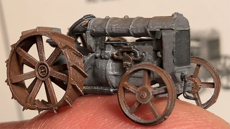 Mike Fisher says he recently exhausted his stash of Jordan Highway Miniatures kits. This model is of a vintage Fordson farm tractor. Shown below is the model relative to Mike's hand.