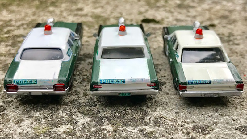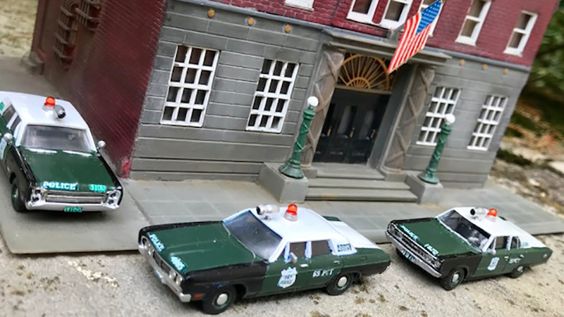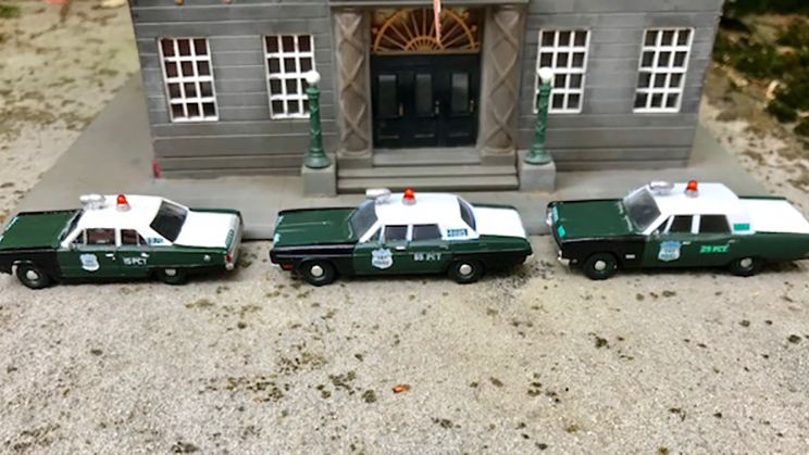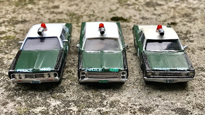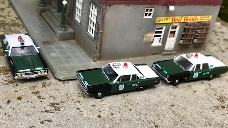 "RMP" is abbreviated for "radio mobile patrol" used by the NYPD (new York Police Department). These squad cars are models of actual prototypes used during the 1960s. The 1967 Plymouth Belvedere is an 87RPM model. The 1968 Plymouth Fury and 1970 Ford Custom are Atlas Masterpiece models. John DaPos hand painted the models and made the decals. He also made the sirens that were on the cars in that era.