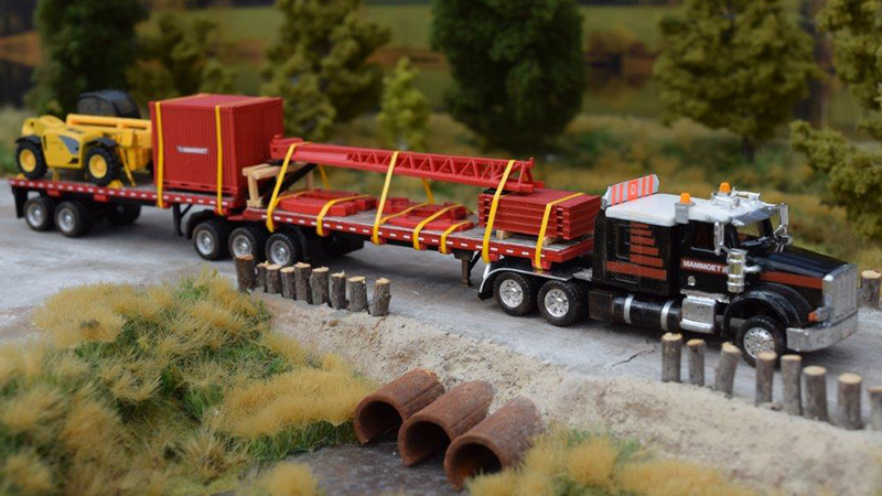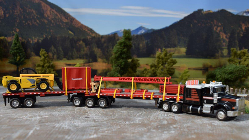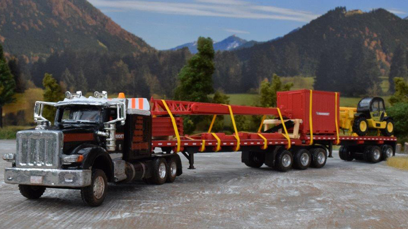 The trailers, as the prototype, are loaded with crane equipment. Parts for the load are from a Kibri crane, a small container from Herpa, and the telehandler is a decent overworked model by NOREV (the window frames of the cab are colored black). Chains to hold it down are by ROCO-Minitanks. Posted January 17, 2019 |