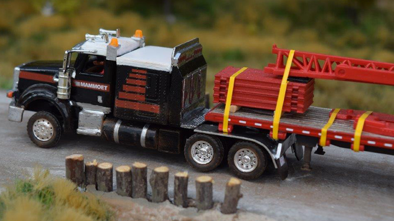 This Mammoet Peterbilt 367 B-Train crane support vehicle was built by Günter Storch. He first saw prototype photos of this truck on the Hank's Truck Pictures Forum a few years ago. The parts of this model spent a long time on his workbench before he decided to finish it this year. The cab and mirrors are by Tonkin with sleeper, wheels, and trailer wheels are by Promotex. The tractor frame and trailers were built with Evergreen styrene and self cast resin parts.