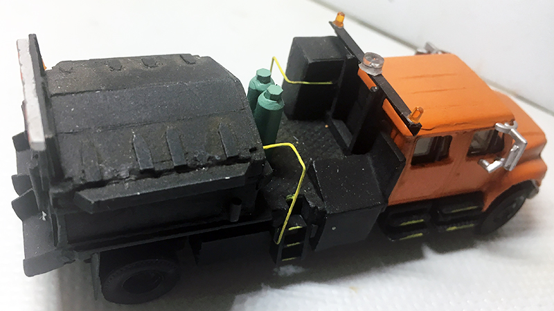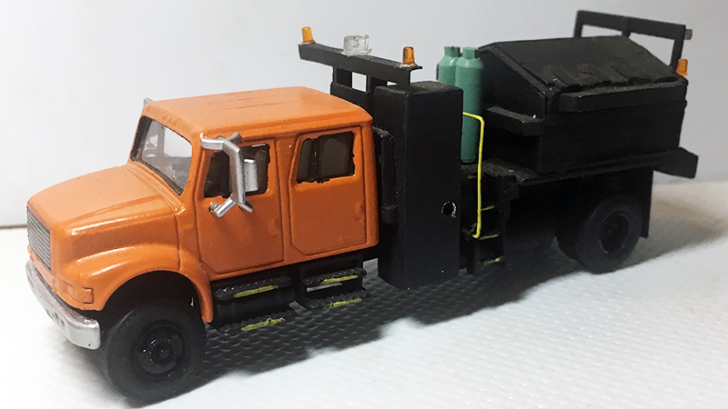 This International 4900 pothole asphalt patch truck was built by Brian Donato using a Boley die-cast crew cab paired with a scratchbuilt pothole patch body mounted on a modified Boley frame with A-Line two hole wheels.