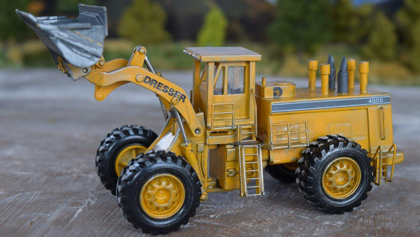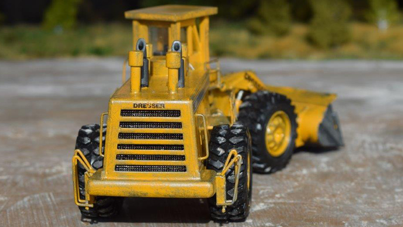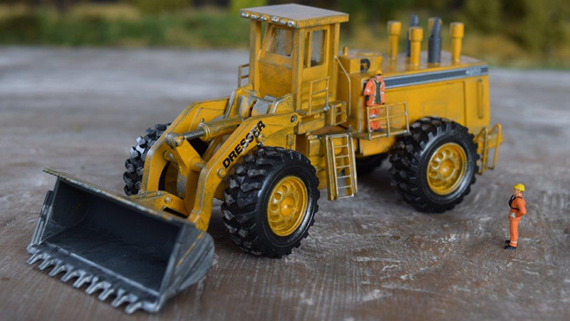 For this model, Günter Storch used the parts of a toy loader in a bigger scale and, luckily, it was an International. He was able to use parts of the frame, loading frame with bucket, and the wheels. He had to rebuild the motor cover, ladders, gangways, cab, air breathers, and exhaust with Evergreen styrene. Decals are self printed. The Life-Like Ford F-150 is shown for a relative size comparison.