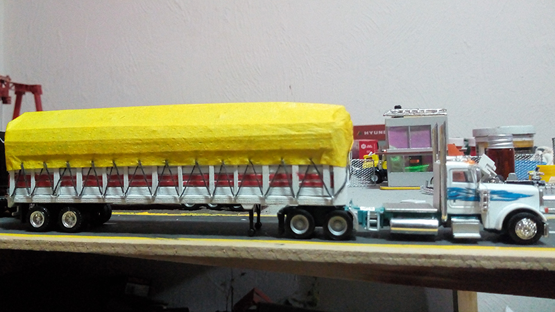 Maxwell Lara used a Trucks N' Stuff/Tonkin die-cast Peterbilt 389 truck tractor and a kitbashed "covered wagon" trailer built using a Con-Cor model.