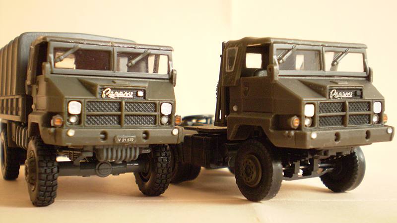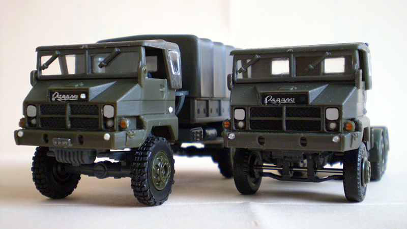 Pegaso 3050 converted to a truck tractor (shown above and below, right) using a Nimix cabin, Roco chassis, and Herpa wheels.