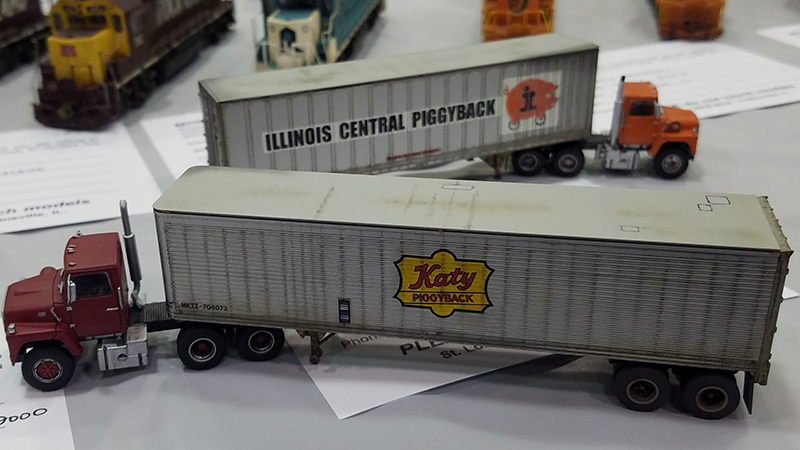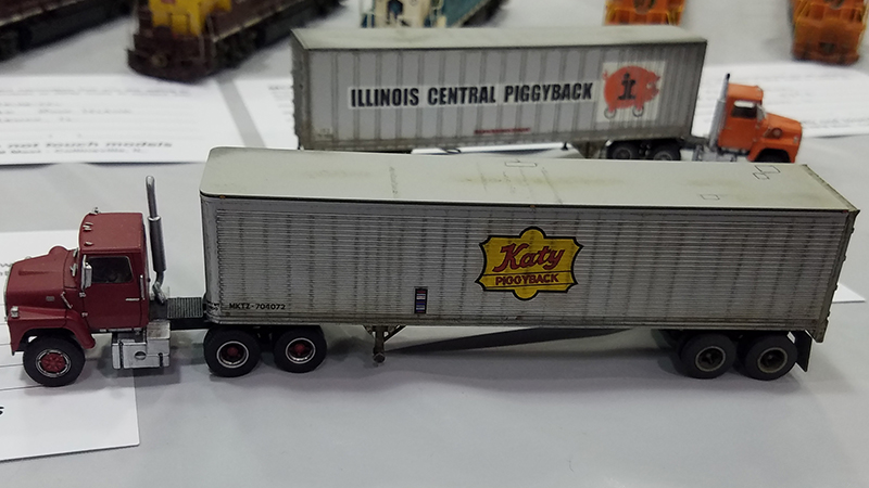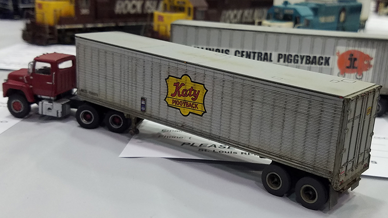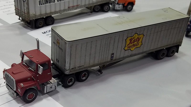 Kevin Niehiesel had this Katy Railroad 40' piggyback trailer and Ford LNT-9000 truck tractor on display at the 2019 Midwest Meet in July 2019. The trailer is a Trainworx model with added weathering and details. The Ford is an Atlas model with new wheels and tires, added mirrors and windshield wipers, and frame crossover plate behind the cab.