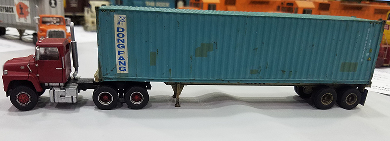 This Ford LNT-9000 truck tractor and 40' container on chassis built by Kevin Neiheisel were on display at the 2019 Midwest Meet in July 2019. The Ford is an upgraded Atlas model awhile the container and chassis are weathered Athearn models.