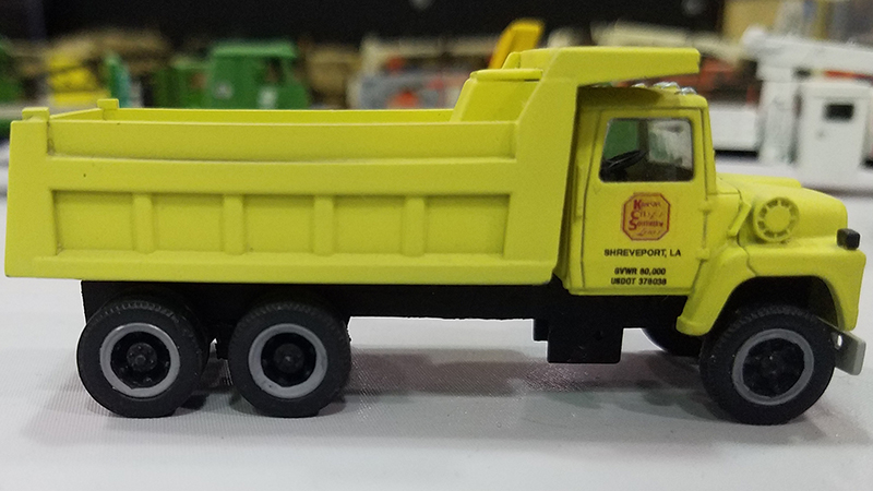 This Kansas City Southern Ford LNT-9000 dump truck was built by Paul Knowles from an Atlas models with stretched chassis and scratchbuilt dump body.