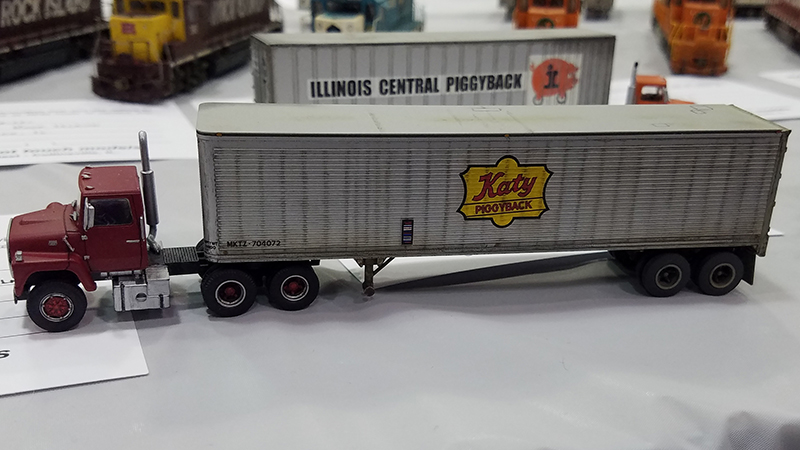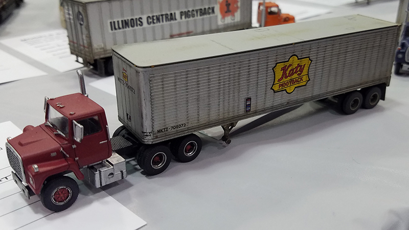 Here are more photos of Kevin Neiheisel's Katy Railroad 40' piggyback trailer and Ford LNT-9000 truck tractor on display at the 2019 Midwest Meet in July 2019. The trailer is a Trainworx model with added weathering and details. The Ford is an Atlas model with new wheels and tires, added mirrors and windshield wipers, and frame crossover plate behind the cab. Previously shown in Photo Gallery 789.