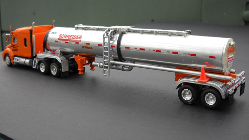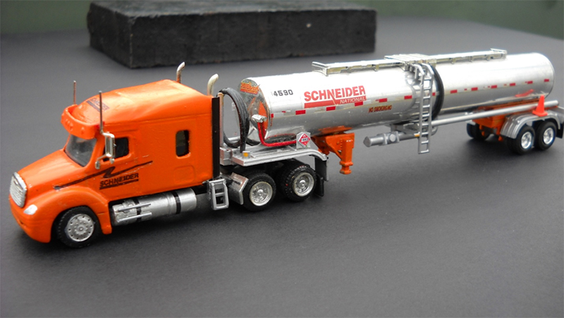 This Schneider National bulk tanker from Matthew Johnson is all Truck N' Stuff. The Freightliner Columbia truck tractor was modified to a mid-roof version. The tanker suspension was moved toward he rear to make room for the pump hose. Fuel tanks, mirrors, stacks, and visor are from Trucks N' Stuff. Graphics on Demand assisted in supplying the decals.