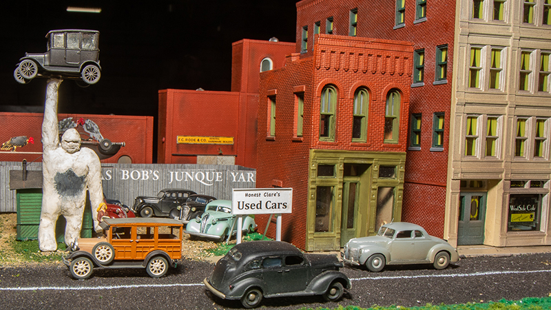 Bill Badger exhibited a new Route87 module at the 2020 East Coast Meet in W. Springfield, Massachusetts this year. Bill's models include several Sylvan Scale Models in the "Honest Clare's Used Cars," a shout out to Sylvan's owner, Clare Gilbert. The Ford Model A Woody in the foreground was built from a Jordan plastic kit.