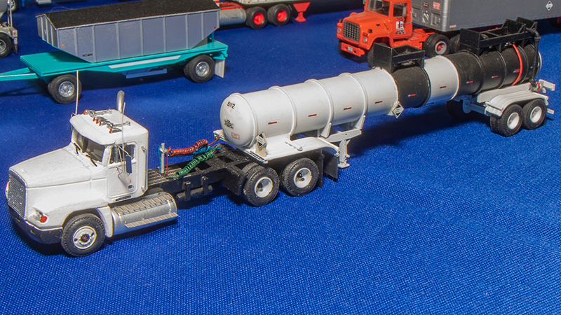 This fantastic Freightliner FLD120 truck tractor and asphalt trailer built by Brad Hassler was on display at the 2020 East Coast Meet in W. Springfield, Massachusetts this year. The truck tractor is based on an Italeri Freightliner cab with A-Line wheels, various photo details from Plano Model Products, and kitbashed frame. The trailer was built from Ralph Ratcliffe Models' outstanding resin kit.
