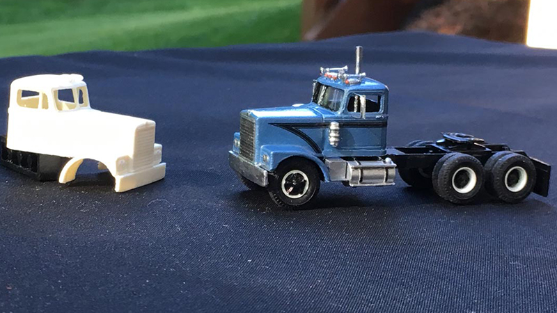 This Diamond Reo C116 truck tractor model from Paul Kittle started as a 3D print from Dwayne Currie that he cleaned up slightly and added his own cab then made a mold and made a casting of it (shown below).The chassis is a collection of parts from various sources. A remarkably beautiful model!!