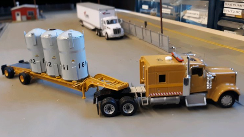 This is a model of the trucks that they use from Los Alamos National Labs with radioactive waste going to Southern New Mexico. Bev got the pictures off the Internet and made the casks out of water pipe and putty. Bev says he's been fascinated by this kind of waste movement all his life both by rail and truck. The truck tractor was made from a Trucks N' Stuff Kenworth W900L. The trailer started as an American Limited heavy 20' container trailer.