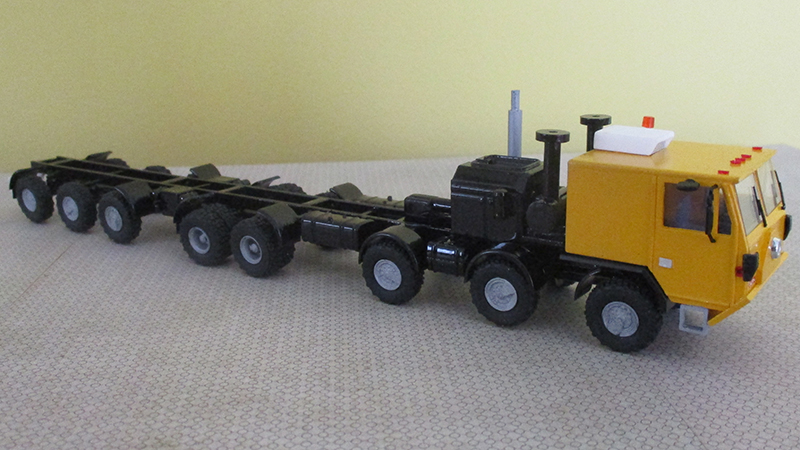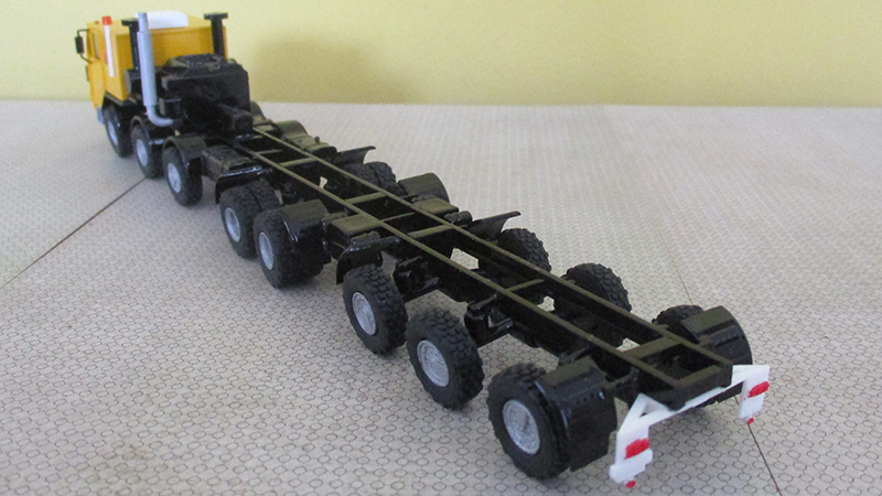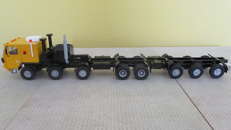 This Jan Romijn's latest, a Tatra 16x16 built it like the other one introduced in Photo Gallery 796. It was built all with Evergreen styrene and the wheels are from Roco. They transport the truck to Germany to provide it with the drilling equipment. The truck has a C32 Caterpillar engine what gives a 1,100 horsepower.