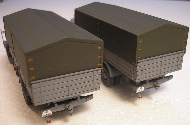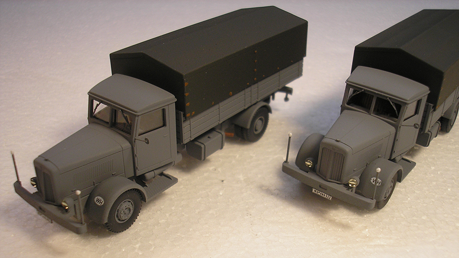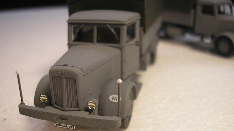 Rick Hoskinson found a couple of discarded cargo beds and tarp covers in his spares box and thought he might be able to use them to produce a couple of 4 ton cargo trucks by converting a pair of Wiking moving vans that had their bodies used for other projects. They all but fell together and the only thing left to do was to finish detailing them and paint them Panzer Grey.