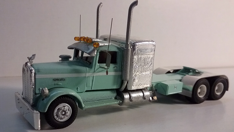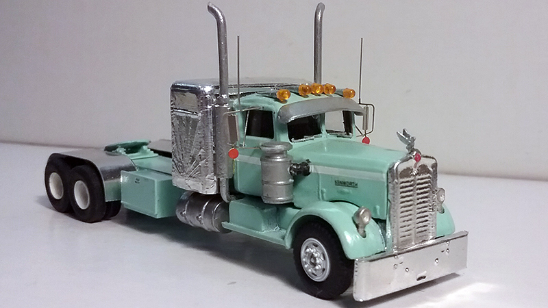Brad Hassler built this Kenworth Needlenose truck tractor from an old Ulrich Kenworth metal kit. Brad stretched the frame and added the 3D printed Mercury sleeper. Tires are from A-Line with hubs are Resin Unlimited. The air breather is from Shapeways with headlights, exhaust, and sun visor from Alloy Forms. Plano mirrors, homemade rear fenders and clearance lights with fifth wheel from Ralph Ratcliffe Models and radiator mounted swan from Bruce Barney.
