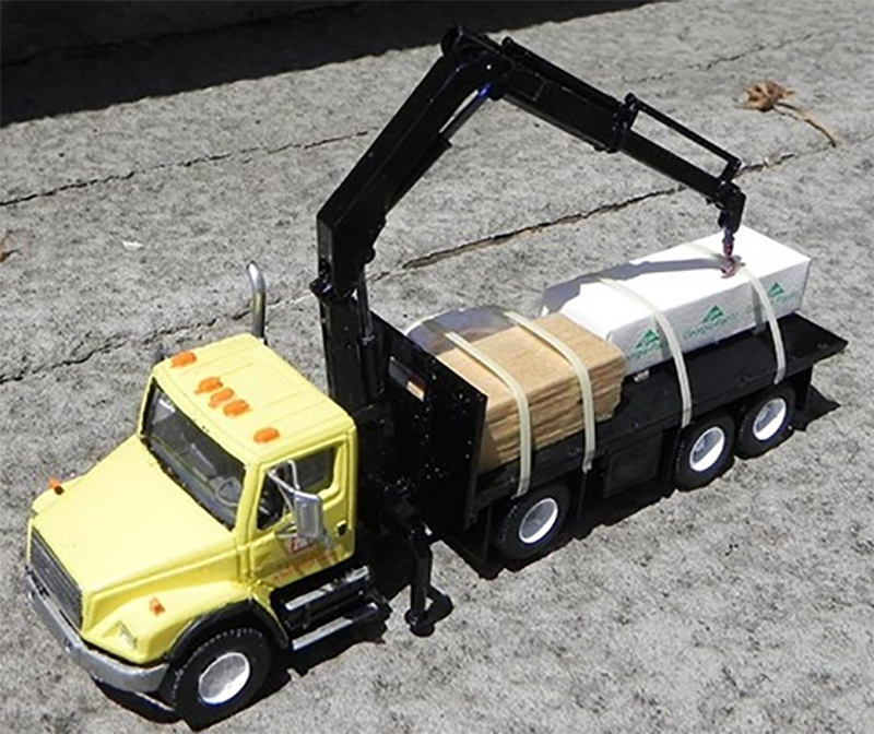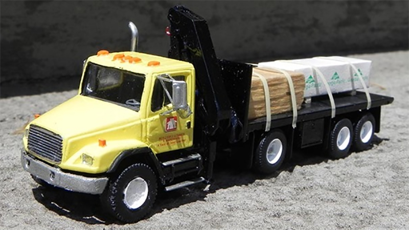 Jim Groeneweg used a RMM resin cab of an Freightliner FL70 mounted on a modified chassis to accept a lift axle. Steer axle wheels are Jacobs spoke flotation with Athearn spoke wheels on the rest with a Promotex HIAB crane mounted on chassis with a Lonestar flat deck installed, and Masterbilt Models heat shield on an aluminum exhaust stack. The model was painted in authentic Home Hardware colours and some Graphics On Demand decals.