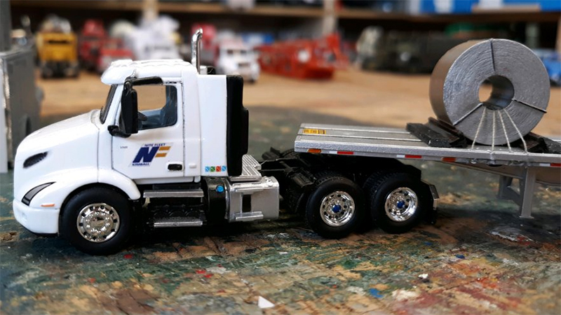 This Volvo VNL760 day cab truck tractor is a First Gear die-cast model to which Bev Fitzpatrick has added decals for his Fortnite Fleet. The trailer is from Trucks N' Stuff with steel coil load from an unidentified source.