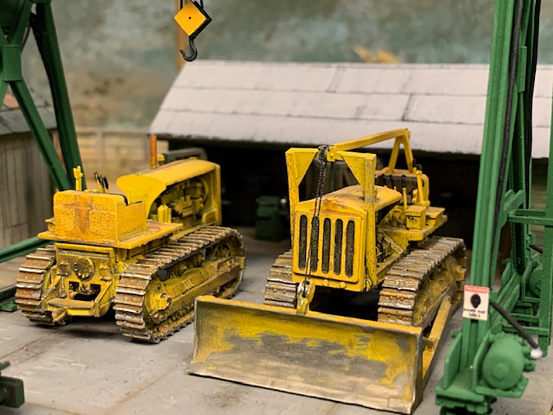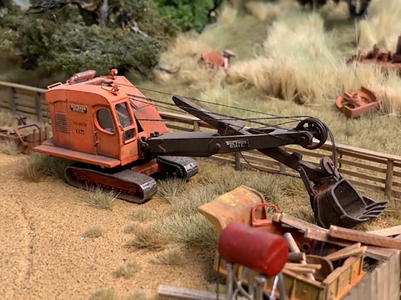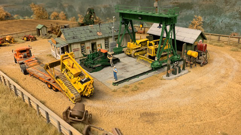 Here's another look around the equipment yard on Kevin Shanahan's HOn3 layout of Ophir Loop, Colorado in the early '50s, focusing on the vehicles around the equipment company yard outside of Ridgway, Colorado. Shown above is an Autocar truck tractor built from an Alloy Forms metal kit and lowboy trailer built from a GHQ metal kit. The crawler tractors/dozer are also built from GHQ metal kits. The Bucyrus-Erie cable shovel was built from a Langley metal kit.