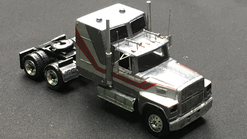 Paul Kittle built this Ford LTL-9000 using one of his Ford resin castings and adding a modified an out of production Masterbilt Mack Superliner sleeper. Both the Ford and Mack 1:1 scale sleepers were made by Able with just slight differences to the lower front bulkheads. Paul added scratchbuilt fuel tanks and battery boxes, made his own decals to represent the factory "Hard Fan" paint scheme. Posted September 26, 2021 |
