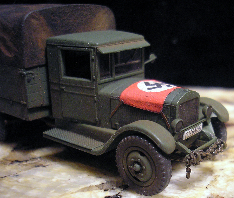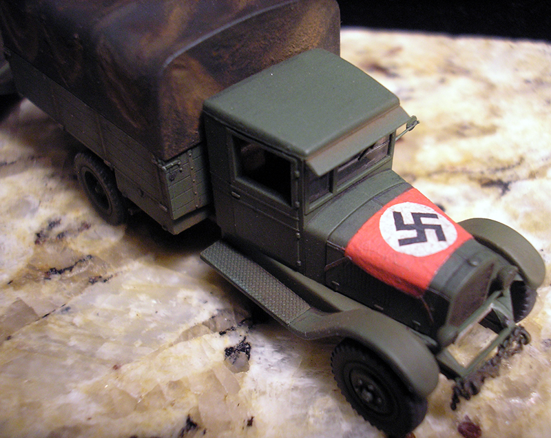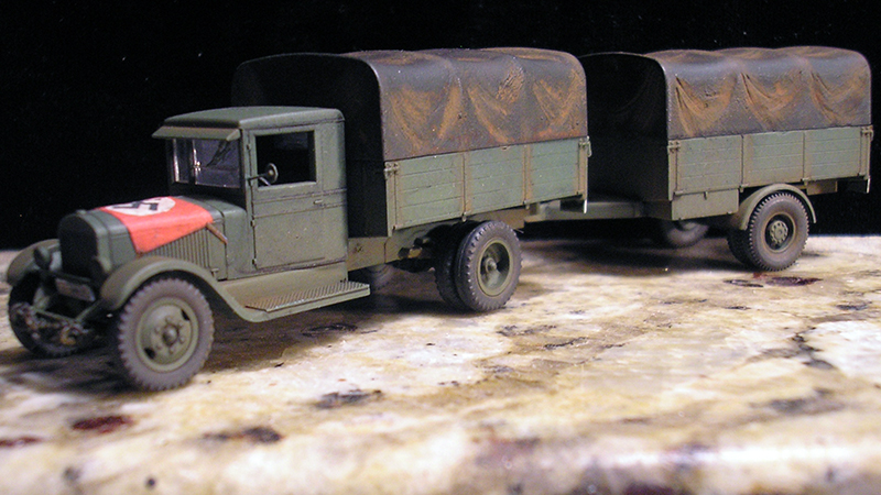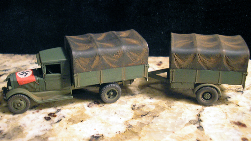 The Roco/Komo kit was the base kit for this project and the trailer was made up from the leftover bed and tarp from a previous fuel truck project. Since this is a "captured" vehicle the large aerial recognition flag on the hood was fashioned from a candy bar foil. Other scratchbuilt details are side mirror, exhaust system, etched brass running boards, shift lever, and license plates. The trailer frame is from Herpa as well as the jerry cans. Fenders are scratchbuilt from styrene and wheels and tires are from the spares box. Paint is Model Masters Russian Armor Green. Decals are from TL.