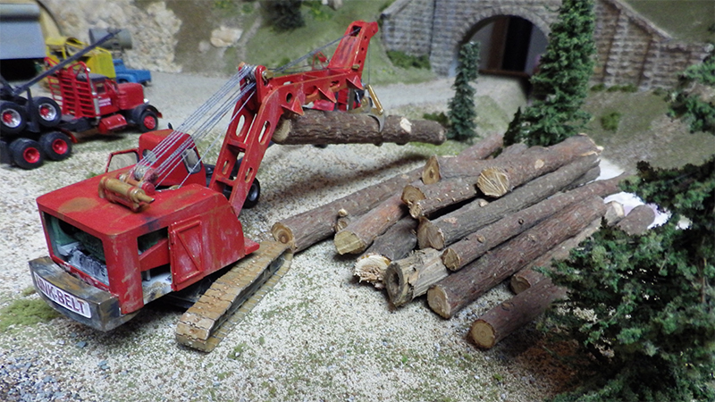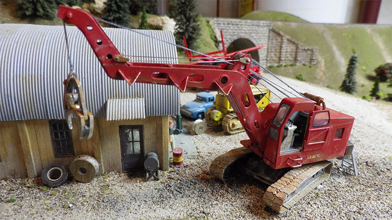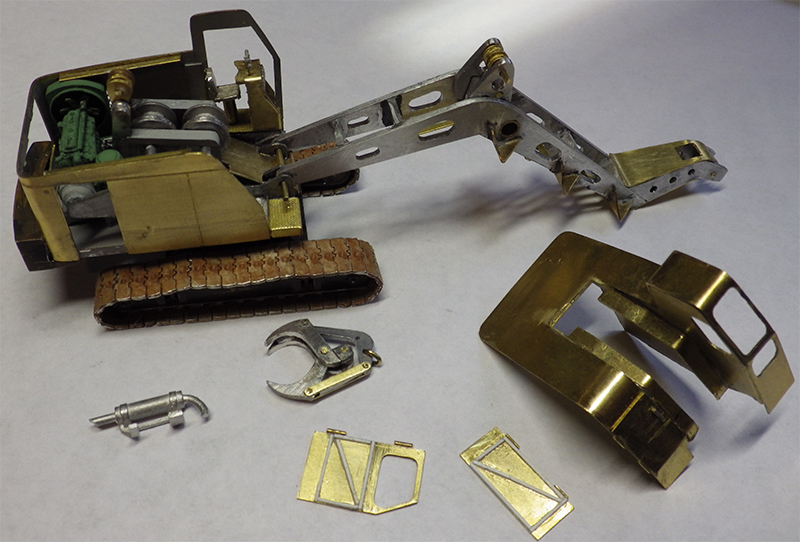 This machine was probably the most common log loader in the northwest U.S. It is a Link-Belt model LS 98 TL with the optional two foot elevated cab. Roger Dowden built this model using a track assembly and counterweight from a Sheepscot Link-Belt kit and constructed the rest from brass and aluminum (see bottom photo). The one exception is the Detroit Diesel 6-71 diesel engine from Ralph Ratcliffe Models. Building a working log grapple was an interesting challenge, reports Roger. The paint and weathering came from his dwindling cache of Floquil paints.