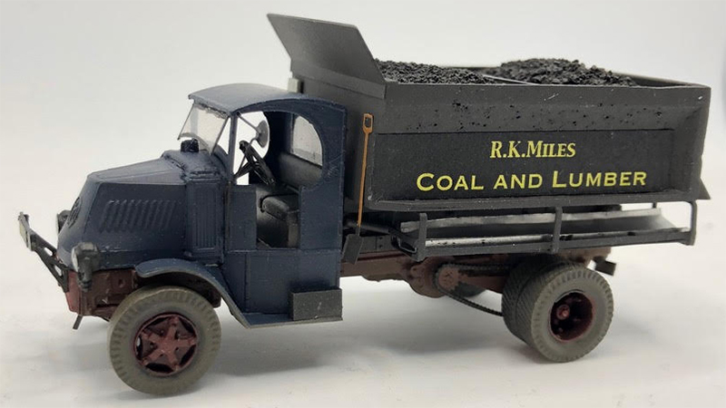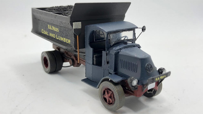 Bill Badger used a Jordan Mack AC hi-lift coal truck to build this late AC coal truck. The last run of Jordan kits included a one piece hood casting, headlights, a front bumper and open cab doors. The hi-lift mechanism was lowered to level and a Sheepscot body replaced the smaller box that came with the kit. Bill says there are more bubbles in the coal body casting than in a bottle of Coke, but they only show in close up photography. Wheels are an old Ivers Engineering set and the windshield, rear view mirror and coal chutes and rack are homemade.