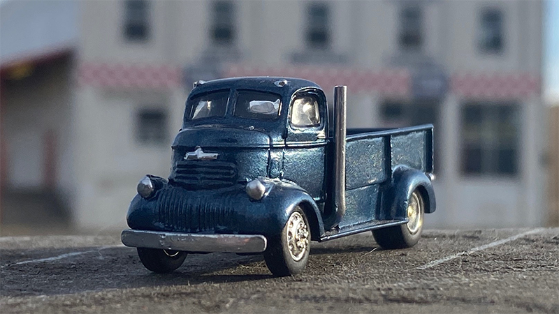 This big blue pickup from Richard Olson started as a Sylvan Scale Models 1941-47 Chevrolet COE resin cab and chassis. The truck was lowered on a set of die-cast toy wheels and tires. A scratchbuilt pickup bed was installed which uses the rear fenders from a CMW ‘41-‘46 Chevrolet pickup, widened to fit the dual wheels. The model was painted in Duplicolor automotive touch-up paint. Custom straight exhaust pipes were added and it and the trim highlighted with a Molotow Chrome pen.