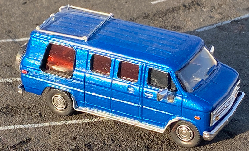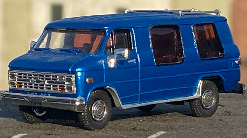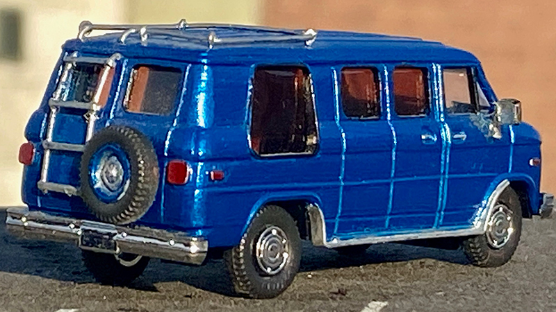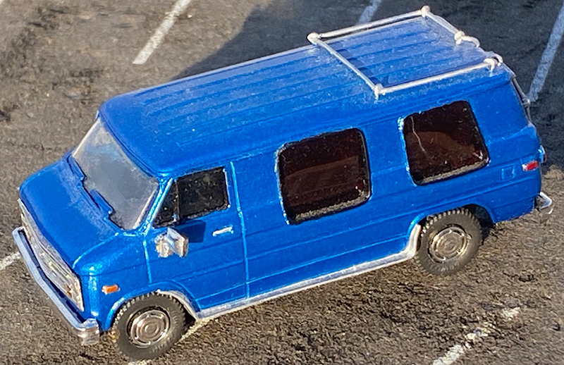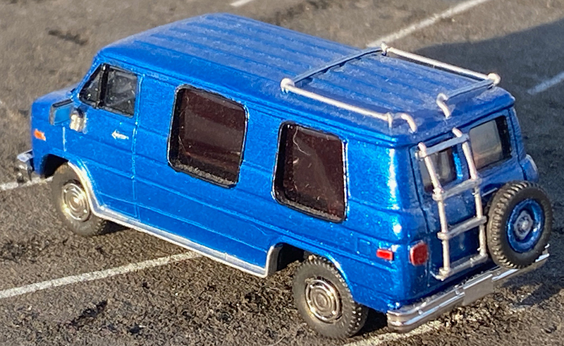 This 1990s Chevrolet G20 conversion van from Richard Olson started as a plain Trident cargo van with the grille replaced with that from the Trident pickup. The windows were cut out and framed and the running boards, roof rack and ladder were scratchbuilt. Roco tires are mounted on Busch Caprice wheels, except for the spare. Painted with Duplicolor automotive touch-up blue. Rear window ‘glass’ is exposed 35mm film strip.