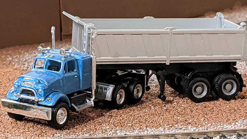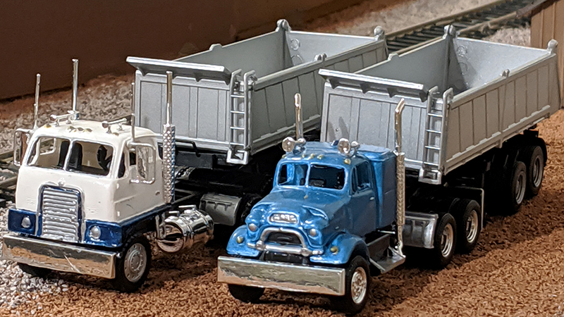 Raymond Schwedhelm built this pair of classic dump rigs using Sylvan Scale Models resin cabs mounted on Promotex chassis. The white and blue International Emeryville and metallic blue GMC 860 are both mated to Herpa/Promotex 24' dump trailers.