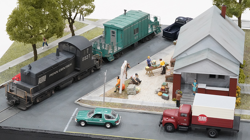 This diorama from Charles Malinowski depicts street running railroading In Lebanon, Indiana in the 1970s. For railroad fans, the EMD SW1 locomotive is from Walthers and the transfer caboose is from Bluford Shops. The AMC Pacer in the foreground is from Fresh Cherries and the Sears International R190 delivery truck is from Classic Metal Works. On display at the 2022 Midwest Meet/St. Louis RPM Meet