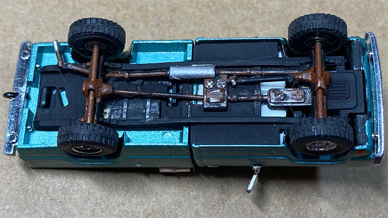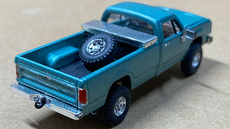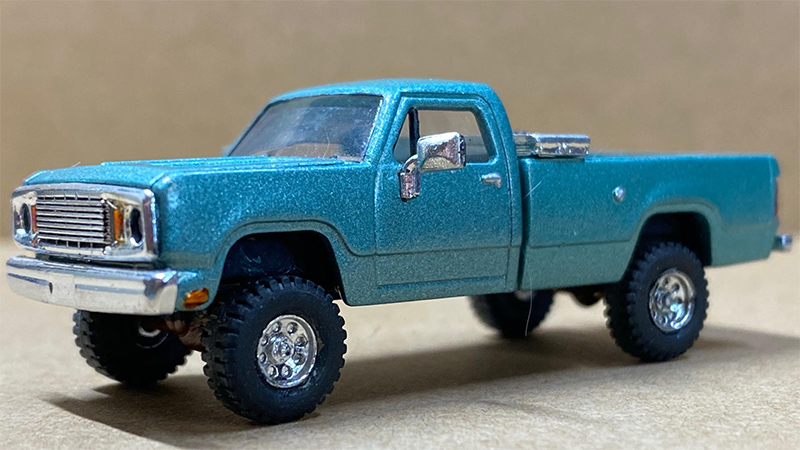 In the early 2000s, Richard Olson found several of the repackaged plain white Roco Dodge pickups under the Promotex label. He decided to add a ‘lift kit’ and new wheels (Trident) and larger tires (Roco HMMWV). What the pictures don’t show off is the working ‘suspension’ and ‘flex’. Custom Testors model car spray covered the stock body. A Details West bed toolbox and a spare tire rack were added. Then it sat in the parts cabinet for 15-years. Richard pulled it out and Bare Metal Foiled the toolbox, added Trident mirrors and detail painted the interior, engine, and chassis. Completed in 2020.