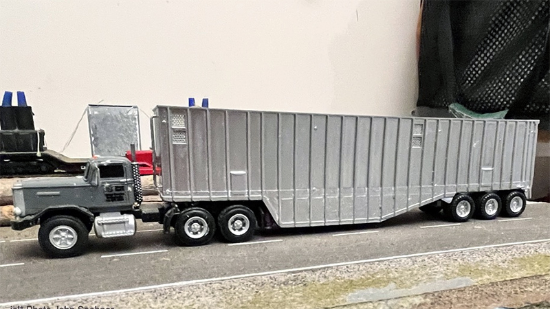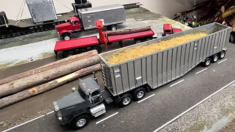 At the 2024 East Coast Meet held in conjunction with the Amherst Model Train Show, John Soehner purchased four "seconds" (less than perfect) 3D resin prints from Justin Grim’s of Grim Bros. Models spares box. One trailer, a wood chip trailer had suffered some imploding of the walls of the trailer, was resurrected with some wedging of thicker cardstock to stretch the walls wider. Rather than fill the trailer full of sawdust (suitable wood chip material), more cardstock was fitted part way up in the trailer then sawdust mixed with carpenter glue, thinned with rubbing alcohol and water to fix the sawdust in place, was added to the trailer. The sawdust was a bit course so a thin covering of finer “fluff,” Woodland Scenic static grass flock, topped off the load. The wheels on the trailer are from Herpa/Promotex. The tractor a Sheepscot Autocar DC13064 cab married to a Boley tandem chassis some ten years ago. The Boley tires were traded out for larger 1/64th tires from an 1/64th Ertl gasoline semi-trailer vehicle.