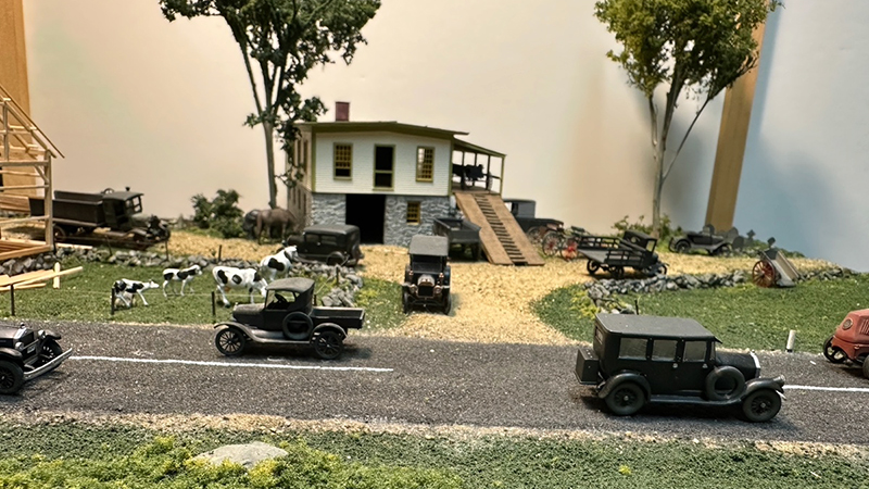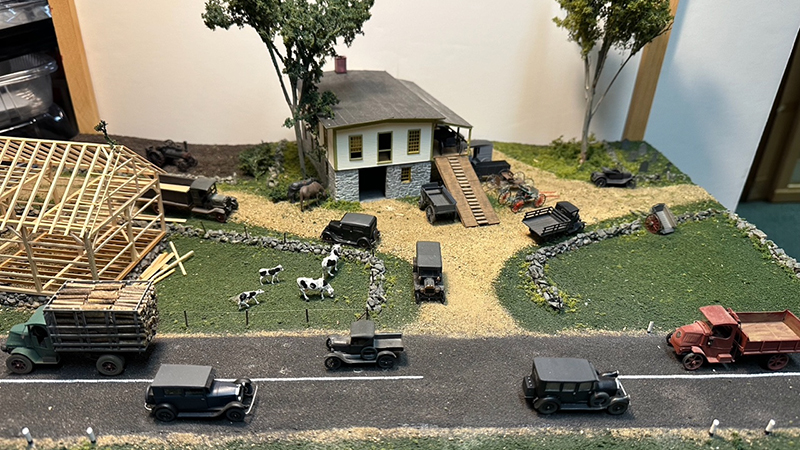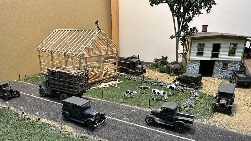 Bill Badger had this diorama with a 1920s theme featuring a carriage works operation and lots of wagons and buggies around. The barn frame under construction is what is known as an “English barn,” a style quite common in New England. Carriage shops often had a blacksmith shop on the ground floor with stone walls for protection from sparks and a wooden upper floor where woodworking and painting was done. Vehicle models are from a variety of manufacturers.