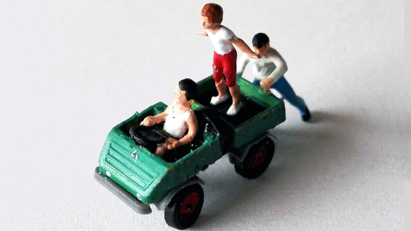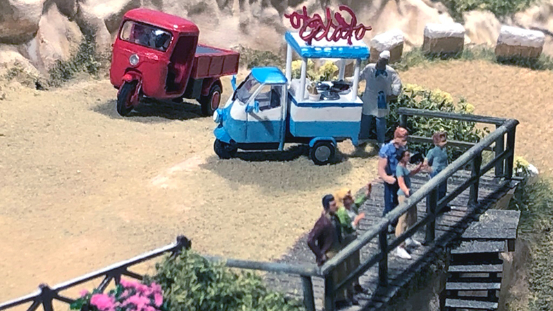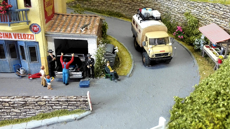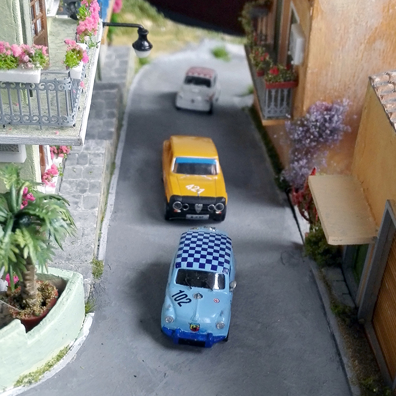 These spectacular little diorama photos arrived from Hartmut Peters without any accompanying text. It appears to us to be a route for a road rally vendors tending to spectators from their Piaggio Apes and the Fiat-Abarth and Alfa Romeo rally cars barreling through the narrow streets.