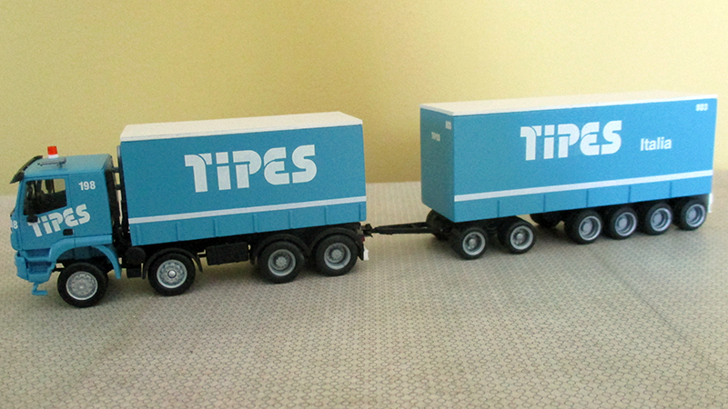 Jan Romijn built this Italian Iveco truck and trailer for steel coil transport. He reformed the chassis into an 8x4 configuration and the trailer he built himself from Evergreen styrene. The decals are from TL Modellbau and as you can see, a lot of parts from the spare box were used.