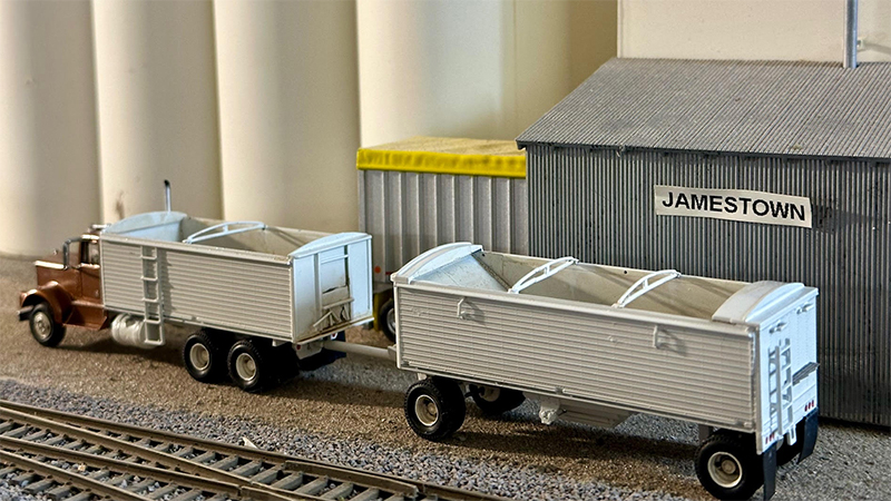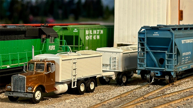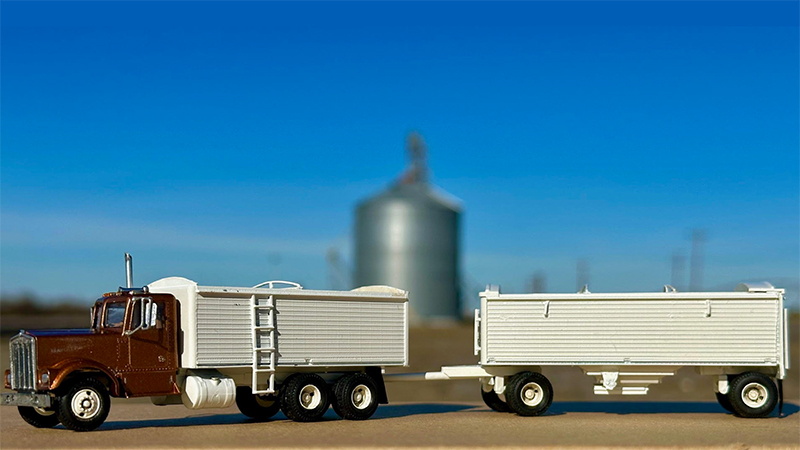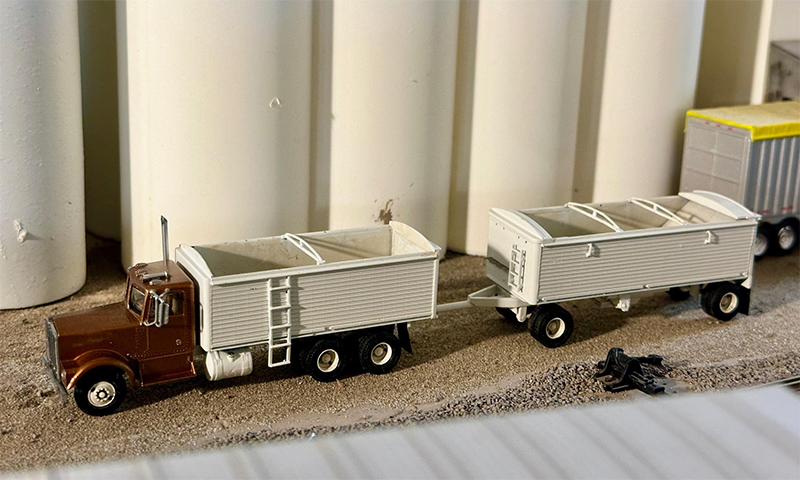 Richard Olson kitbashed an Athearn Kenworth W900 truck tractor and Lonestar Models 43' Wilson grain trailer into a small farmer’s truck and pup trailer setup. He bought a partially built Lonestar trailer kit that needed help so he could build this. He removed the molded in floor and cut off the front 18 feet of the sidewalls, then reattached the front wall to the new 22 foot trailer. He added a single hopper chute, modified the rear suspension to a single axle, and scratchbuilt the new dolly. The truck body consists of new front, rear, and floor mated to the Lonestar sides. A parts box ladder was added to the side. An Athearn Kenworth kit was used, stretching the chassis to fit the new bed. Modified Athearn fuel tanks and exhaust, kitbashed interior from Herpa and Alloy Forms, and A-Line wheels and tires were used on all axles. Painted in Duplicolor spray White and Carmel then some Testors, Tamiya detail paint, and washes to finish it off. Indoor pictures taken on the Cascades and Deschutes Model RR in Portland, Oregon.